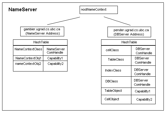 Another design decision involved the hierarchical structure of NameContexts on the name server, as described in the previous section on the data structures. The NameServer contains a root name context object, and one name context object for every application server in the system, including the NameServer. For the purposes of this system, an application server is any node/computer which hosts publicly accessible objects (non proxy objects) which can be used by remote clients.