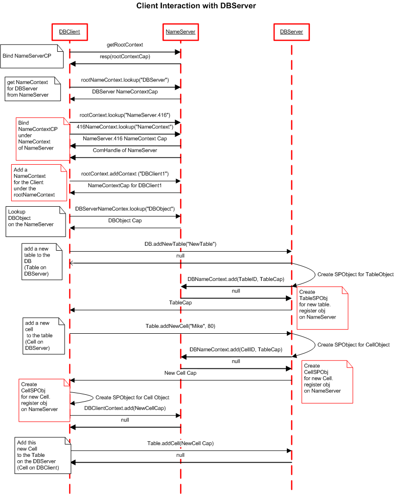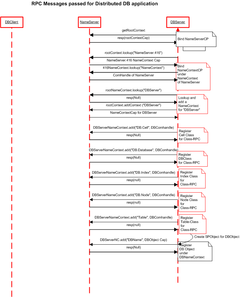 For the sequence diagram, on the DBServer side, the DBServer registers its NameServerCP and NameContextCP classes with the NameServer. Then, the DBServer creates a new namecontext object on the NameServer for the DBServer. Under this new name context, the DBServer then registers all of its related database classes (Database, Table, index, cell, node) with the NameServer for class based RPC. Finally, the DBServer creates a local database object, and registers this object on the NameServer under the NameContext object for the DBServer.